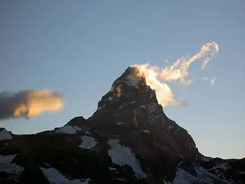 The name Breuil-Cervinia is a fusion of two terms. On the one hand was Breuil, in French, the original name of the place before the tourist settlement was built, derived from Valdôtain dialect Breuill indicating a marshy meadow, or a field where streams are numerous.[5] Breuil and its derived forms have commonly appeared in Aosta Valley, France, and Romandy.[5] On the other was Cervinia, the toponym that was given to the hamlet following the process of italianization of placenames in the Aosta Valley wanted by the fascist government, a reference to the Matterhorn mountain (italian: Monte Cervino).