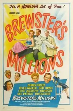 Brewster's Millions is a 1945 American comedy film directed by Allan Dwan and starring Dennis O'Keefe, Helen Walker and June Havoc. It is one of many film adaptations of the 1902 novel of the same name by George Barr McCutcheon and the subsequent smash-hit play adaptation by Byron Ongley and Winchell Smith. In the novel, Brewster is a stockbroker; in this version, he is portrayed as a returning soldier.