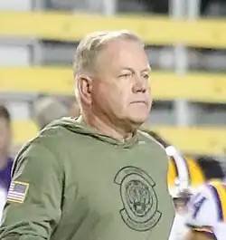 Brian Keith Kelly (born October 25, 1961) is an American college football coach. He is the head football coach at Louisiana State University (LSU), a position he has held since the 2022 season. Kelly served as the head football coach at Grand Valley State University from 1991 to 2003, Central Michigan University from 2004 to 2006, the University of Cincinnati from 2006 to 2009, and the University of Notre Dame from 2010 to 2021. He led the Grand Valley State Lakers to consecutive NCAA Division II Football Championships in 2002 and 2003. Kelly's 2012 Notre Dame team reached the 2013 BCS National Championship Game, while his 2018 and 2020 Fighting Irish teams made appearances in the College Football Playoff.