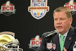 In December 2009, Kelly agreed to replace Charlie Weis as Notre Dame's head coach.[43] On December 10, Kelly announced that he had taken the position at Notre Dame.[44] He made the decision not to coach the Bearcats in the Sugar Bowl on January 1, 2010, which the Bearcats lost in a blowout to the University of Florida Gators.[45][46]