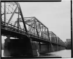 The second bridge was a 7-span through Pratt truss structure completed in 1921.[2] Each span was approximately 152 feet (46 m) long, consisting of six 25-foot-4-inch (7.72 m) panels for a total of approximately 1,064 feet (324 m) between abutments, and a 23-foot (7.0 m) curb-to-curb width.[2] The design load limit was 15 short tons (14 t), though this was reduced to 10 short tons (9.1 t) in 1977.[2] The truss structure was built by the Berlin Construction Company, directly north of the previous bridge.[2][3]