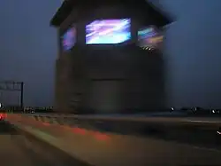 Housed inside the bridge's original watchtower (or bridge tender's house), each of the six windows has a group of reflective, dichroic acrylic kaleidoscope cones that feature abstract reflective floating surfaces of color and light. The bottom of each cone has a mirror and a light that assists in producing a reflection. Each angle produces a different hue which emanates from the windows, visible from the bridge, the Washington Metro and the Potomac River, but in compliance with U.S. Coast Guard regulations, not allowing it to distract drivers on land or water. Overall, the piece sends out "thousands of glimmering colors in six directions where a drawbridge once sat."[1][2]