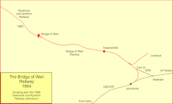 - Bridge of Weir; the station was closed on 18 May 1868 for the upgrading work in connection with the extension to Greenock; when the line re-opened the station on the Greenock and Ayrshire line opened, on 23 December 1869; it closed on 10 January 1983.[4]