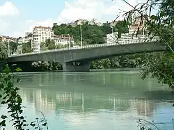 A bridge was built in 1911–1912 between the Quai Saint Vincent and the Place de L'Homme de la Roche.[5] Along less than 100, the bridge consists of a 5 m road and two sidewalks of 1.25 m (4 ft 1 in). It was the only bridge, the bridge with St. Vincent, not destroyed in 1944 by German forces, so it allowed the 1 st division French free to return to Lyon on September 3, 1944 to liberate the city. Considered too old and dangerous, it was demolished in 1986–1987. It was replaced in 1989 by a temporary metal bridge, made in Villefranche-sur-Saône and sent by barge. But this bridge has the particularity to finish almost in cul-de-sac at the foot of a hill next to La Croix-Rousse and the other from that of Fourviere. Reconstruction is not really considered urgent and the temporary pedestrian bridge is still in place.