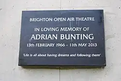 Brighton Open Air Theatre, also known as B•O•A•T, is a British theatre built in Dyke Road Park, Brighton, which opened on 9 May 2015. It has been paid for not by corporate funding or public grants, but by private donations. The theatre is the legacy of the Brighton showman and construction manager, Adrian Bunting, who died of pancreatic cancer, aged 47, in May 2013.