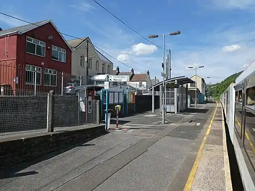 Brithdir railway station is a railway station serving the village of Brithdir near New Tredegar, South Wales. It is a stop on the Rhymney Line 18+3⁄4 miles (30.2 km) north of Cardiff Central which is part of the Transport for Wales network. Work to extend the platform for six-car trains is in progress.