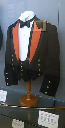 For officers, a black 'cut-away' cavalry style mess jacket is worn with a scarlet stand collar, with gold piping. The corps badge is featured on the collar. The mess jacket also features scarlet shoulder straps and scarlet cuffs, and a scarlet waistcoat is worn which buttons to the neck and is fastened by gold buttons. NCOs wear instead a scarlet single-breasted mess jacket with a black shawl collar with the corps badge on each lapel, black cuffs, rank stripes on the upper right arm, and no shoulder straps. A black single-breasted waistcoat with no lapels and four gold buttons is also worn.[36]