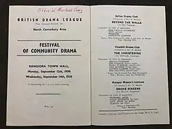 The British Drama League (New Zealand Branch) was established in 1932, as a New Zealand chapter of the British Drama League, a society that had been founded in England in 1919 to promote both amateur and professional theatre. It was founded by a small group of drama enthusiasts—predominately women, although with men offered the more senior positions.[1][2][3]