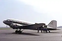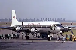 BUA began operations from its new base at Gatwick Airport with a mixed fleet of 43 airliners and 47 helicopters. The former included Douglas DC-3 Dakota/C-47 Skytrain, DC-4/C-54 Skymaster and DC-6 piston airliners as well as more modern Bristol Britannia and Vickers Viscount turboprops. These continued serving the all-economy Safari and colonial coach class (British residents only) routes to East, Central, Southern and West Africa pioneered by both Airwork and Hunting-Clan,[18][19][20][21][22] as well as operating trooping flights from Stansted under contract to the Ministry of Defence (MoD)[23] and assorted passenger and freight charter flights these airlines and their associates had provided.[24] During its first year of operation, the BUA group's 90-strong fleet flew 17.8 million revenue miles (28.6 million revenue kilometres), carrying 631,030 passengers, 143 million pounds (lb) (64,867 [metric] tonnes (t)) of freight and 25,749 cars (carried by Channel Air Bridge).[18]