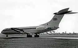 In early 1961, BUA applied to the Air Transport Licensing Board (ATLB),[35][36][37] a predecessor of the Civil Aviation Authority (CAA), for a large number of domestic and international short-, medium- and long-haul scheduled route licences to give its scheduled network the critical mass to become financially viable by 1965, and to provide sufficient work for a planned £20 million fleet of new jets comprising four long-haul Vickers VC10s and five short-/medium-haul DH 121 Tridents. BUA's applications included a request for twice-weekly all-economy/colonial coach class flights linking Gatwick with Istanbul, Teheran, Karachi, Delhi, Calcutta, Bangkok and Singapore, with a weekly extension to Hong Kong and Tokyo, respectively. BUA intended to inaugurate its first-ever scheduled services to Asia with DC-6Cs or Britannias, which were to be replaced with the new VC10s at a later stage. The airline planned to charge standard IATA fares on all sectors. In addition, it proposed to offer British residents flying to Singapore and Hong Kong in Skycoach[nb 6] an 18% discount on the equivalent economy class fares.[18][21][22][28][29][30][38][39] In May of that year, BUA became the first independent airline in the UK to launch a brand-new jet aircraft, when it placed an order for ten short-/medium-haul BAC One-Eleven 200 series.[2][40][41][42][43] The same month, the airline placed an order for four Vickers VC10 long-haul jets costing £2.8 million apiece.[44][45][46][47][48][49] Laker personally negotiated these orders with both manufacturers. The combined order value was £20 million.[50] At that time, the ATLB conducted a hearing into BUA's applications for over 20 scheduled route licences to enable it to expand the European network to include a number of major trunk routes from its Gatwick base, such as Gatwick to Paris, Milan, Zürich, Amsterdam and Athens, in competition with existing services of BEA from Heathrow.[30][51] Although the ATLB granted BUA the requested licences for 12 of these routes, the airline was unable to use them without actual traffic rights.[52] [53] These needed to be negotiated on its behalf between the UK Government and its overseas counterparts.[53][54] Following the ATLB's decision, BUA commenced scheduled services between Gatwick and Tenerife in October 1961 using Viscounts.[55][56][57] The same month, the airline started Viscount trooping flights from Gatwick to Germany under contract to the MoD.[58][59]