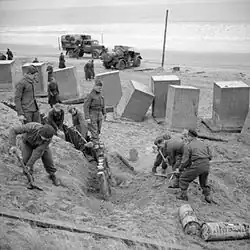 Beaches were blocked with entanglements of barbed wire, usually in the form of three coils of concertina wire fixed by metal posts, or a simple fence of straight wires supported on waist-high posts.[65] The wire would also demarcate extensive minefields, with both anti-tank and anti-personnel mines on and behind the beaches. On many of the more remote beaches this combination of wire and mines represented the full extent of the passive defences.[66]