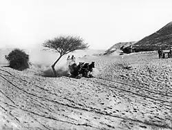 Spasmodic bursts of long-range shells fired from a German naval pattern 6-inch (15 cm) gun, occurred throughout the British Empire occupation of the Jordan Valley. Some 30 shells were fired at various camps and horse lines in the neighbourhood during the first week. During June they steadily increased artillery fire on the occupied positions, freely shelled the horse lines of the reserve regiment along the Auja, and at times inflicting severe casualties.[25][52][53]