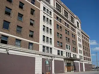 When it opened in 1927, the hotel was the largest and most luxurious hotel in the city. The 260-room hotel included a restaurant, a rooftop garden, a ballroom and meeting rooms, and air conditioning and bathrooms in each room. The hotel intended to attract both local civic groups and out-of-town visitors; it succeeded in this in its first year, as the city's Elks Lodge moved to the building and the Illinois State Convention of Realtors held its annual meeting there. The hotel also housed the studio for the first radio station in East St. Louis; WIL broadcast from the studio from 1927 to 1935, when WTMV took over the studio. The Rotary club of East St Louis held their weekly noon meeting from 1927 for over 30 years. Rotarians were investors in the building as well. The hotel remained one of the city's most important until the 1950s, when large hotels became less popular nationally. In 1957, Southern Illinois University began renting office space in the building, as it had recently opened a satellite campus in East St. Louis; the university purchased the hotel outright in the 1970s. Since the university left the building in 2004, it has remained vacant.[2] The building was added to the National Register of Historic Places on December 31, 2013.[1]