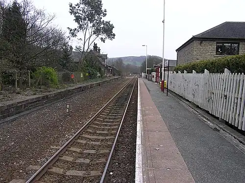 The southbound platform went out of use when the Stocksmoor to Huddersfield section was singled in 1989. Only the northern end of the former Huddersfield-bound platform (which has been raised to modern standard height) is now used for rail services; the other end is disused and fenced off. The main buildings on the southbound side have been restored and converted into a private house, complete with heritage signage.[2]