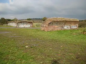 Construction on the Northern Heights project began in the late 1930s but was interrupted by the Second World War. Most of the work to that date had been carried out on LNER branch tracks, but work between Edgware and Bushey Heath had started in June 1939. The route of the line had been cleared and laid out and some earthworks and tunnelling carried out between Edgware and Elstree South.[13] At the site of Brockley Hill station and south of Edgware Way, construction of the piers of the viaduct had begun and three out of 12 arches at Brockley Hill station had been completed by August 1939.[13] Following the outbreak of war in Europe, work on the station and the extension was suspended in September 1939 and was formally terminated in December of the same year as wartime funding restrictions would prevent completion.[14] During the war years, the LPTB-owned land was used for farming vegetables for staff canteens.[15]