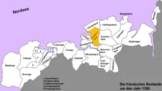Brokmerland (yellow), within the Seven Sealands (white) around 1300 | |||||||||