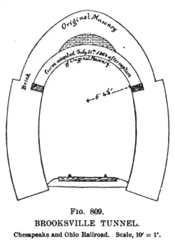 Portions of the Brookville tunnel were lined with brick for added strength, with the brickwork originally contracted to Joseph Dettor, a local brickmaker. Because of the poor quality of Dettor's bricks, Crozet decided to use these bricks on the Greenwood Tunnel to the east, which was a stronger bore than Brookville.[42] Crozet estimated in 1854 that the total number of bricks required for the entire tunnel would be upwards of 750,000.[25] After examining the offers of multiple brickmakers,[43] the Virginia Board of Public Works contracted Robert Harris to provide the bricks for the Brookville Tunnel.[42] The resulting arch was between 3–4 feet (0.9–1.2 m) in thickness over the entire length of the tunnel, and formed an opening approximately 20 feet (6.1 m) high and, at the extreme, 15 feet (4.6 m) wide.[44]