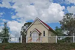 Elizabeth Mary Thomas née Eaton, formerly Mrs B J Nichols, donated land from the property Clifton for a church and cemetery. Subscription towards the building fund were made on the understanding that the church was dedicated in the name of St Mary to the memory of Woocoo Shire soldiers killed in action in World War I.[13] Opening services of the St Mary's Anglican Church were held on 26 October 1919.[14] The church was built by Matthew Edmund Rooney of Maryborough.[14] There is a group of three stained glass windows behind the altar. In 2019 residents and descendants of past residents attended a 100th anniversary service, and a plaque to commemorate the occasion was unveiled in the church grounds.[15] The church is variously described as being located at Boompa, Brooweena, or Teebar.[16]