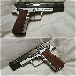 In 2018, FN announced they would end production of the Mark III Hi-Power, which was expensive to produce and had been assembled in Portugal to cut costs. Early in that year, Browning officially ceased production of the Belgian Hi-Power for the first time since 1935. An unlicensed clone called the "Regent BR9" was produced in Turkey by TİSAŞ in 2019 and had gained some popularity now that authentic Hi-Powers were no longer being made and surplus Hi-Powers from other countries like Hungary and Argentina had dried up. The Regent BR9 design was more of a copy of the Mark I design, but did offer some modern design features, like a Cerakote or stainless steel finish and Novak-style sights.[10] The BR9 was soon discontinued, but, in 2021, another Turkish company called GİRSAN began producing their own Hi-Power clone called the MCP35, imported by EAA. In 2021, American firearms company Springfield Armory announced their own Hi-Power clone, the SA-35.[11] GİRSAN and Springfield Armory's clones began competing with each other by offering new design improvements that would help them compete in the oversaturated defensive handgun market. GİRSAN's MCP35 attempted to replicate the Mark III design as closely as possible, including the Belgian-style ambidextrous thumb safety, Mark III-style sights with a windage drift adjustable rear sight and dovetailed front sight, and Mark III-style black polymer grips. The MCP35 also retained the Belgian magazine disconnect safety. However, the MCP35 incorporated the original ring hammer design instead of the claw hammer design of the Mark III and also incorporated some design elements to appeal to the modern shooter, such as a 15-round Mec-Gar magazine and Cerakote finish.[20]