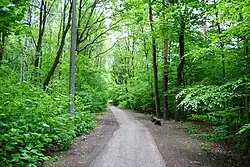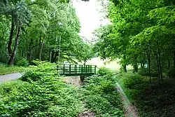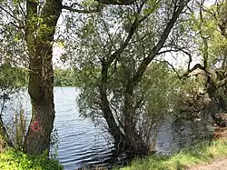 In the Muchowiec area, at the border of the Brynów-Osiedle Zgrzebnioka and the Osiedle Paderewskiego – Muchowiec districts, the Katowice Forest Park is located. This extensive area, featuring ponds, parkland, and forests, is one of the most environmentally attractive places in Katowice, offering a variety of habitats that support a rich diversity of flora and fauna.[27] The most common tree stands here are mixed oak and birch forests with an admixture of pine. In the undergrowth, along with young trees, there are also rowan, alder buckthorn, elder, and red elderberry. The groundcover is lush and floristically rich, with species such as wood horsetail, wood anemone, and King Solomon's-seal.[28] Valleys of small streams and moist depressions are covered by patches of riparian forests. The forested areas of the Katowice Forest Park, bordering directly on streams and water bodies, are ideal for the development of amphibians and many bird species. Migratory birds, such as the common kingfisher, little ringed plover, and grey heron, have been observed here. Amphibians found in the area include the common toad, common frog, and smooth newt.[29] Common forest birds, such as Eurasian jays, common blackbirds, thrushes, finches, tits, nuthatches, and great spotted woodpeckers, are also present. The forests are home to squirrels, and occasionally rabbits and deer. There is an abundance of mice, voles, and insectivorous species, and wild boars are spotted in the winter.[30]