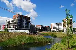 The northeastern part of the district, including Katowicka Hałda, the northern part of Kościuszko Park, the A. Zgrzebniok Estate, and areas around Ceglowa Street, belongs to the Vistula river basin. The first two areas fall within the Rawa river catchment, while the others are part of the Potok Leśny catchment. These two catchments are separated by a fifth-order drainage divide, but neither river flows directly through the district.[10] Within the Potok Leśny catchment, there are two notable water bodies. One is a pond located in a landlocked area near Ceglowa Street,[10] adjacent to the Ceglana Park residential complex.[15] The second is Grünfeld pond, situated southeast of the first.[10] Covering an area of over 4 hectares with a depth reaching up to 20 meters, it is fed by natural groundwater that emerges due to the intersection of aquifers during clay extraction. This pond is privately owned.[16]