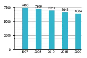 The population of Brynów-Osiedle Zgrzebnioka shows a declining trend. In 1997, the district had 7.4 thousand residents,[36] in 2005 the population was 7,206,[86] and in 2010, it was 6,951 (2.3% of Katowice's population).[87] During this period, 12.7% of the district's residents were in the pre-productive age group, 58.1% were in the productive age group, and 29.2% were in the post-productive age group.[88]