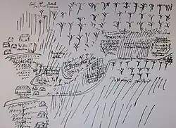 In the late 14th and early 15th centuries, Upper Silesia experienced an economic collapse, partly due to the Hussite Wars. This decline was marked by numerous deserted settlements.[42] Brynów was first recorded as an abandoned village in 1486.[43] However, it did not vanish entirely, as its nearby arable fields continued to be used by residents of neighboring settled villages.[43] The process of resettlement began in the late 15th century. Even in 1609, Brynów remained uninhabited,[43] with the first settlers' names appearing only in documents from the 17th century.[41] Brynów is marked on one of the oldest maps of modern Katowice, dated around 1686. This hand-drawn map was created during a legal dispute over logging rights in forests belonging to Kuźnica Bogucka.[44]