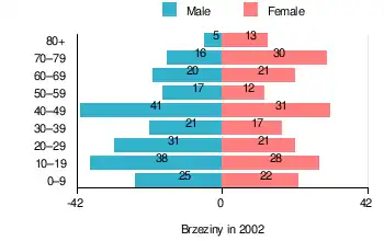 According to the 2002 Poland census, there were 409 people residing in Brzeziny village, of whom 52.3% were male and 47.7% were female. In the village, the population was spread out, with 24.9% under the age of 18, 33.3% from 18 to 44, 18.3% from 45 to 64, and 23.5% who were 65 years of age or older.[1]
