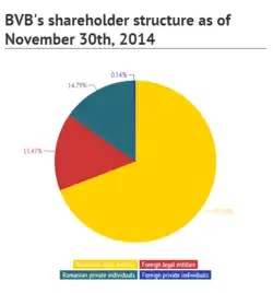 Since 2010, Bucharest Stock Exchange is listed on its own market, with a symbol BVB. Bucharest Stock Exchange has a single class of common shares and a capital of 76,741,980 lei divided in 7,674,198 shares with a nominal value of RON 10 per share. All the shares are fully paid. The free float of BVB shares is equal 100%. In accordance with the provisions of the Government Emergency Ordinance no. 90/2014 amending and supplementing the Law no. 297/2004 regarding the capital market, a shareholder of a market operator cannot own directly or indirectly more than 20% of the total voting rights. As of November 30, 2014, the Romanian legal entities constituted the largest group of the BVB shareholders (69.19%), followed by foreign legal entities (15.47%), Romanian private individuals (14.79%), and foreign private individuals (0.54%). In November 2014, European Bank for Reconstruction and Development has acquired 4.99% stake in the Bucharest Stock Exchange.[14]