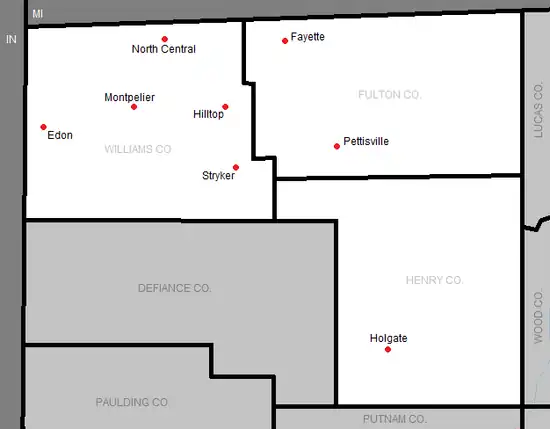 ^Edon, Hilltop, Montpelier, and North Central have football teams that participate in the Toledo Area Athletic Conference, while Montpelier kept its wrestling program in the NWOAL.[1] Holgate and Stryker participate in 8-man football as members of the Northern 8 Football Conference.