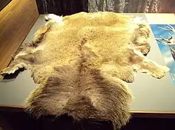 Traditionally, Native American Indians would scrape away the excessive fat clinging to the hide, and this would be followed by working the raw hide with the brain tissue of an animal.[1] Afterwards, the raw hide is made to envelope a fire that emits wood smoke, and where the smoke is mostly trapped inside the raw hide for many hours.[1] The combined application of brain tissue and smoke produces soft and pliable buckskin leather, with a dark honey color. This treatment differs from the traditional tanning methods used in other societies and cultures and is thought to be preferable to vegetable tanning methods where tannins are exclusively used.[1] The finished product resembles chamois leather, but is stronger.[1] Smoking gives to the leather its durability, and although buckskin may become slightly stiff when it dries after being wet, it quickly restores itself to its former soft-state by rubbing it with the hands.[1] The application of wood smoke also deters insects from devouring it. Unsmoked buckskin is lighter, even white, in color.