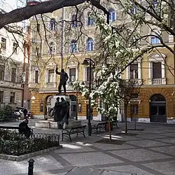 As the post-war communist regime consolidated its grip, the names of a number of streets and institutions in the Palotanegyed were changed. In 1946 Főherceg Sándor utca (Archduke Alexander Street) was renamed Bródy Sándor utca.[46]Sándor Bródy (writer) (1863-1924) was a Jewish-born novelist, dramatist, and short-story writer who was 'among the first in Hungarian literature to focus attention on the urban proletariat, and the first to introduce the coarse and pungent vernacular of the big city into literary works'.[47] In the same year the metropolitan library in the former Wenckheim Palace was named the Szabó Ervin Library in honour of Ervin Szabó, a revolutionary socialist who translated the works of Marx and Engels into Hungarian and who in 1911 had been appointed the library's director.[48] In 1949, Eszterházy utca and Ötpacsirta utca were renamed Puskin utca.[49] Two years later, in 1948, the section of Baross utca in front of the library was renamed Szabó Ervin tér[50] Surprisingly, the communist regime did not rename the József körút (Joseph ringroad), named after the Archduke of Austria and Holy Roman Emperor Joseph II, as it did the Teréz and Erzsébet stretches of the ringroad, also named after Habsburg monarchs. In 1950,[51] Horánszky utca, named after Dual Monarchy-era Hungarian member of parliament and trade minister Nándor Horánszky,[52] was renamed Makarenko utca, in honour of Soviet educational theorist Anton Makarenko. In 1962, Rökk Szillárd utca, named after a wealthy 19th century philanthropist, was renamed Somogyi Béla after a leftist journalist murdered by White forces in 1920.