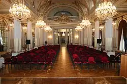 The Golden Hall, reserved for ceremonies and other formal events, was inspired by the Hall of Mirrors in the Palace of Versailles, France. It is reached by climbing the Stairway of Honor. Columns with Ionic capitals surround the central area, supporting an arched gallery which serves as a balcony over the central area. At its base there is a shield of honor with the arms of the city.[7] The hall is lit by six chandeliers, each with 45 lights, as well as 14 candelabras. The room is used for public hearings, receptions and events.