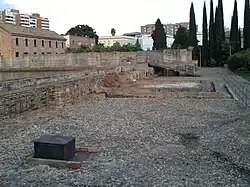 The gardens and their palaces were originally surrounded by a wall made of rammed earth, known as the Ha'it as-Sultan ("Wall of the Sultan").[4]: 213 The Almohad water reservoir, which has been restored and is still visible today, measures 43 by 43 meters and is 2 meters deep. The reservoir's walls rise slightly above the ground and are reinforced with buttresses. Water arrived via an aqueduct from the east and was discharged into the reservoir through a spout at the middle of the reservoir's south side. Any excess water from the aqueduct continued to flow past the reservoir and discharged into the gardens to the west. Three other drains also allowed water to leave the reservoir.[4]: 211