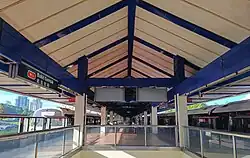 Bukit Gombak station is located in the town of Bukit Gombak, Singapore.[16] It is near the junction of Bukit Batok West Avenue 5 and East Avenue 5 and has four exits serving various nearby landmarks such as the Bukit Gombak Sports Hall, Bukit Gombak Stadium, Bukit Batok Town Park (with Little Guilin), Hong Kah North Neighbourhood Police Post, and Dazhong Primary School.[5][34] Like other stations in the former Branch Line as well as in Khatib and Yishun, it has an inverted, high-pitched V-shaped roof, reminiscent of the Housing and Development Board (HDB) Logo since the station is nestled in a HDB estate.[35][36] It also has brick walls on its exterior similar to nearby HDB blocks.[17] Bukit Gombak has a blue colour scheme to distinguish itself from other stations within that branch.[15]