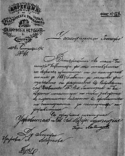 The first Bulgarian school in Thessaloniki was founded in 1871 next to the church of Agios Athanasios. Following the April Uprising of 1876, the Russo-Turkish War (1877–1878), the Kresna–Razlog uprising and other events, the Bulgarian educational cause in Macedonia had to live through a number of blows. Exploiting anti-Bulgarian sentiment among government officials, Greek bishops succeeded in shutting down a lot of Bulgarian schools and in re-introducing the Greek language to Bulgarian churches in the region. As a result, part of the Bulgarian intelligentsia emigrated to the Principality of Bulgaria and the province of Eastern Rumelia. They did, however, manage to continue their work, supported by local municipalities, the Bulgarian Exarchate, and the newly created Bulgarian state. The situation in Thessaloniki remained relatively calm, given the hard situation elsewhere. The presence of foreign consuls and representations was putting some limitations on the Turkish regime. This fact is asserted by some scholars as the main reason behind the opening of a Bulgarian secondary school in Macedonia resembling the ones in Sofia and Plovdiv.[5] In 1880 the Ottoman Empire adopted an Act on Vilaets which limited Greek bishops’ control over Bulgarian churches. Taking advantage of these developments, revivalist Kuzman Shapkarev prepared a whole plan for Bulgarian education in Macedonia, centred on the region’s capital – Thessaloniki. The city ought to host one men’s and one girls’ gymnasium with boarding schools attached to each. Prior to their opening, there was a total of 667 Bulgarian basic schools in Macedonia with 949 teachers and 36,623 students.[6] The main obstacle before Shapkarev’s plan was the Exarchate’s objection to Thessaloniki hosting the gymnasiums. Dragan Tsankov, who favored the idea in principle, proposed another town situated in Central Macedonia and inhabited by a purely Bulgarian population to host the schools.[5] Despite these differences, the Exarchate backed up the initiative and the Sts. Cyril and Methodius Bulgarian Men's High School of Thessaloniki officially opened doors in the autumn of 1880 with the support of the local Bulgarian community and the Exarchate.