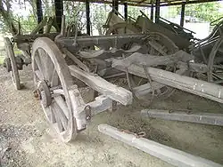 A four-wheeled jinker with a bullock yoke and bows resting on the pole.