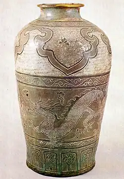 Buncheong is a contemporary term for a specific type of traditional Korean stoneware that developed in the 15th century, during the Joseon period, as Goryeo celadon techniques and subject matter evolved.[1] Buncheong ware developed from the earlier Goryeo celadon inlay technique called sanggam and rapidly distinguished itself.[2][3] In contrast to the refined elegance of Goryeo celadon, buncheong is designed to be natural, unassuming, and practical.[4] This style is characterized by its pale blue-green color and decorative techniques, which involved shaping the clay and then covering it in white slip (ceramics) and decorating it by carving, stamping, and brushwork.[5][1]
