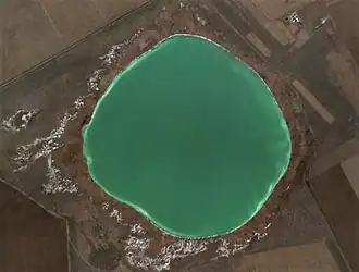 The lake has a roughly round shape, with a diameter of about 2.5 kilometers (1.6 mi). The western and southern lakeshore sections are fringed by salt marshes.[2][3][4][5]