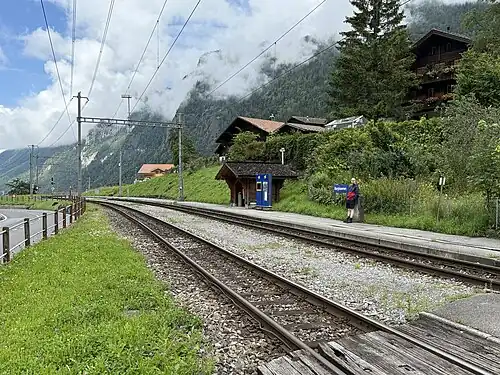 Burglauenen railway station (German: Bahnhof Burglauenen) is a railway station in the municipality of Grindelwald in the Swiss canton of Bern. The station is on the Berner Oberland Bahn, whose trains operate services to Interlaken Ost and Grindelwald. It takes its name from the nearby settlement of Burglauenen.[1][3]