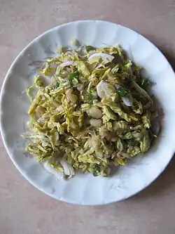 Burmese salads (Burmese: အသုပ်; transliterated athoke or athouk) are a diverse category of indigenous salads in Burmese cuisine. Burmese salads are made of cooked and raw ingredients that are mixed by hand to combine and balance a wide-ranging array of flavors and textures.[1] Burmese salads are eaten as standalone snacks, as side dishes paired with Burmese curries, and as entrees.[2] The most common or popular, the iconic laphet thoke (fermented tea leaf salad) is traditionally eaten as a palate cleanser at the end of a meal.[3]
