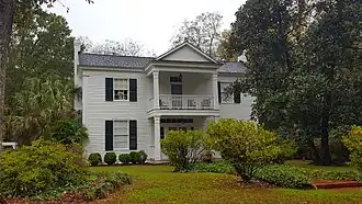 Although located in the city of Newberry, the house is built in the style of plantation houses in the countryside: it features Neoclassical components, although in a diminished and vernacular mode. The house is a two-story rectangle with a central portico dominating the facade. Square wooden pillars support each story of the portico, while pilasters in a similar style are placed at the portico's junctions with the main body of the house. As a second-story door provides access to the second story of the portico, the space between pillars and pilasters is filled with an unadorned balustrade. Multi-pane transom lights are placed above both the main entrance and the second-story door to the portico, in addition to sidelights around the main entrance. Topping the house is a gabled roof, which culminates in a pediment atop the portico.[2] The entire house is a wooden building comprising nearly 5,000 square feet (460 m2), although only about 4,000 square feet (370 m2) are finished. Three fireplaces are located throughout the building, which is underlain by a crawlspace.[3]