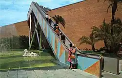 The brewery and gardens officially opened to the public for tours on June 1, 1959, as an admission-free facility with 250 attending the opening ceremony and around 1,000 attendees to Busch Gardens.[18][19] Busch Gardens opened on 15-acre (6.1 ha) of land southwest of the brewery at the cost of around $500,000.[14][15][18][20] The associated gardens featured lagoons and landscaping, with around 36,000 flowering plants and 300 trees.[21][22] Opening animal attractions for Busch Gardens included a bird show in an amphitheater seating around 200 individuals, a bird sanctuary featuring flamingos and a separate animal area named "Devil's Island," and caged enclosures for eagles and cockatoos.[15][23][24] Additional attractions included a dwarf village and the "Hospitality House," a William B. Harvard designed facility that offered free samples of beer to guests.[23][24][25] Another 118-acre (48 ha) was used for housing the brewers Budweiser Clydesdales, and planned to host buffalo, ostriches, and zebras located east of the brewery.[10][26][27] The original gardens was later dubbed the "Bird Gardens".[28]