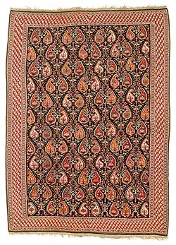 The boteh (Persian: بته), is an almond or pine cone-shaped motif in ornament with a sharp-curved upper end.[1] Though of Persian origin, it is very common and called buta in India, Azerbaijan, Turkey and other countries of the Near East.[1] In India, the shape is associated more with a mango than with a pine cone, and is called ambi, from āmra (Sanskrit: आम्र) meaning mango. Via Kashmir shawls it spread to Europe at least in the 19th century, where patterns using it are known since 1960s as paisleys, as Paisley, Renfrewshire in Scotland was a major centre imitating them.