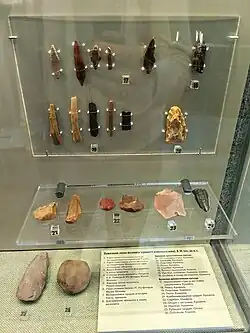 The finds of stone tools consisted mostly of scrapers, picks and axes. Arrowheads were made in two different ways. They were made from regular slats or irregular slats by shaping straight (tanged point) or leaf-shaped arrowheads. Axes ground from slate were common.[1]