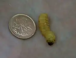 A butterworm beside a Canadian penny | |