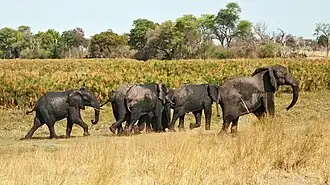Several rare large mammal and bird species are found in Bwabwata. Elephants regularly move between Namibia, Angola, Botswana and Zambia. Other species found are Cape buffalo, hippopotamus, roan antelope, sable antelope, tsessebe, zebra, wildebeest, common reedbuck, red lechwe, sitatunga and crocodile. Main predators are lion, leopard, cheetah and spotted hyena.[5]