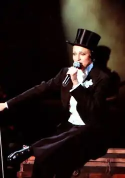 The performance of the song on the Girlie Show tour featured Madonna and her backup singers, DeLory and Haris, dressed as Victorian gentlemen in masculine outfits, including top hats and tailcoat.[29] The whole ensemble was an homage to actress Marlene Dietrich in the 1930 American romance drama film Morocco, with the singer carrying a cane in her hands.[30] The main inspiration behind this segment was 1900s showgirls and Japanese all-female cross dressing dance company, Takarazuka Revue.[31] Madonna transformed her voice into that of a circus ringmaster, introducing the arrival of three female strip-club dancers. A voice-alteration similar to the single was used in the performance. The dance routine revolved around three chairs. The female strippers seduced Madonna and the backup singers, by rubbing against them, holding sexual poses and dominated them, before they took control again. The performance on the November 19, 1993 show at Sydney Cricket Ground was recorded and released on VHS and Laserdisc on April 26, 1994, as The Girlie Show: Live Down Under.[32]