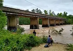 The bridge crossing the Haw River at Bynum was originally a covered wooden bridge. It connected the major north–south highway in piedmont area of North Carolina—with Chapel Hill to the north and Pittsboro and Sanford to the south. The old Bynum Bridge replaced it in 1922 - concrete and approximately an 800-foot span.[6] It was closed to motor vehicle traffic in 1999, but it is currently a pedestrian bridge and part of the statewide designated bicycle route as well as being a gathering place for the community on Halloween where many local folks artfully carve Jack-o'-lanterns and display them along the sides of the bridge. Cars now cross the Haw River on the newer US 15-501 bridges about 1000 feet north. There is another canoe take-out, dam and the mill race sluice gates at US 15-501.