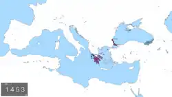 ![]() ![]() ![]() The Despotate of Epirus in dark blue, the Empire of Trebizond in light blue and the Principality of Theodoro in violet. | |||||||||||
